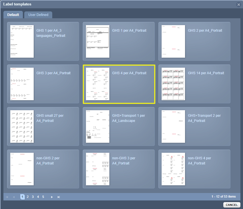 7. Select a Label template from the default label gallery, e.g., GHS 4 per A4_Portrait in page 1 using the mouse hover forward arrow