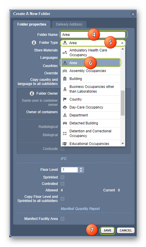 The following steps illustrate creating an Area, Section and Location (Storage folder) under the Manifest directory. User folder permission is required to create and edit folders.