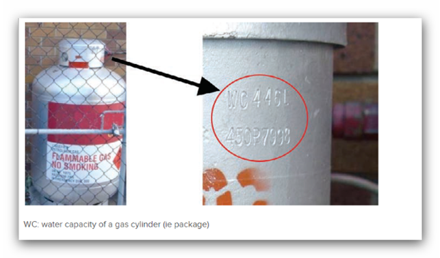 The quantity of gas in a package, e.g., a cylinder is based on the water capacity (WC); which refers to the number of litres of water that would be required to fill the cylinder. However, the labelling usually indicates the mass of gas intended to hold. To determine the volume of a gas cylinder, look for the stamp on the cylinder neck or foot ring, usually accompanied by a “WC” mark.