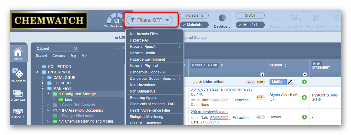 Safety and compliance require that persons using chemicals at the workplace must obtain a hazardous chemicals register, identify all those materials that may cause cancer (carcinogens), hazardous substances to human health, environmental hazardous substance, embryotoxins, reprotoxins, physical hazardous substances, dangerous goods and many more. The system allows users to filter out those hazardous chemicals that fall under that category by using the Hazards Filter.