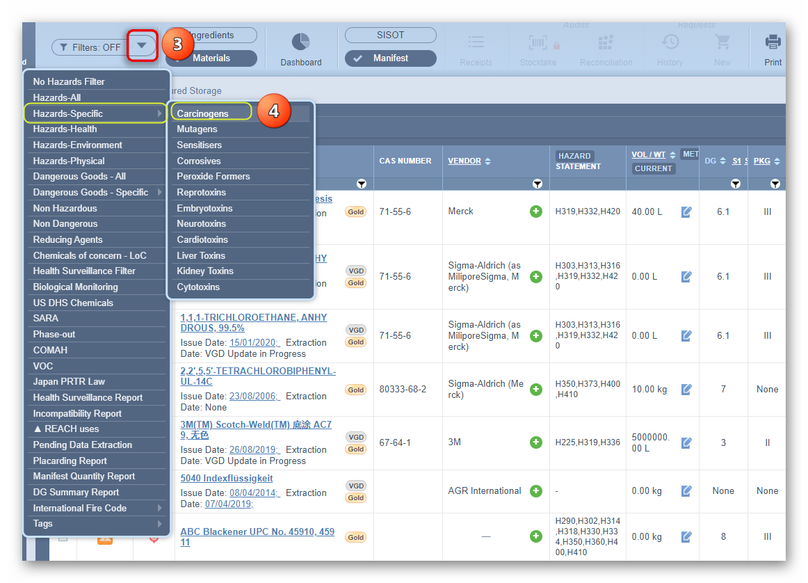 Steps to Filter Materials List by Hazards-Specific Carcinogens