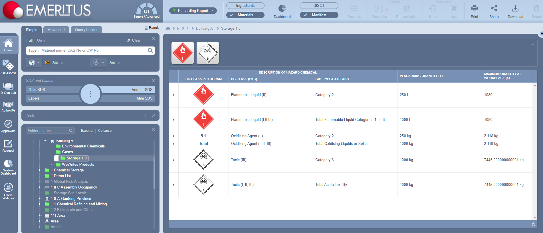 The Manifest mode provides a filter condition for placarding, which displays the Hazchem signage (Placarding Required) in the Manifest Placard area of the user interface based on the volume/weight threshold of hazardous chemicals flagged as dangerous goods in a folder/location.