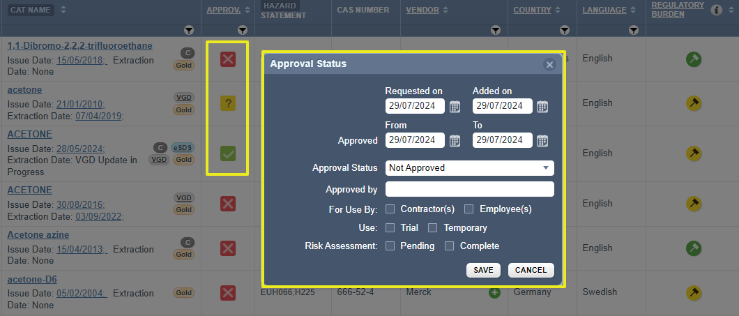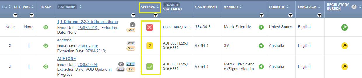 Approv. | This is a user-dependent field for setting an approval status of a material: Set approval by a Specific Person, Use by; Risk Assessment and Dates. Note that this setting does not relate to nor is it linked to the Approvals Module. It is a static record entry. | This attribute can be used for any approval criterion. It provides these Approval Status options: Not Approved, Approval Required or Approved.