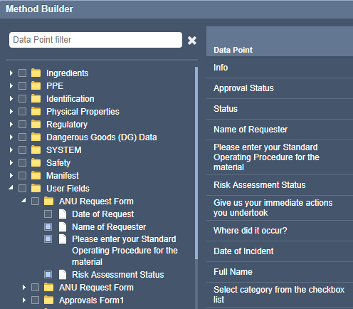 Report Generator Method Builder datapoints directory UI list for User Fields.