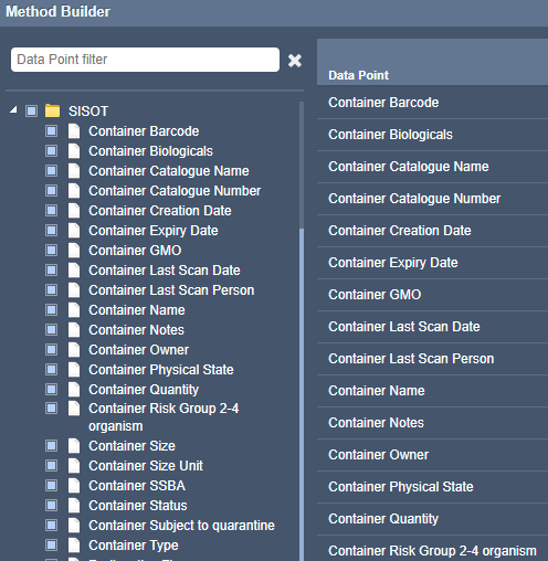 Report Generator Method Builder Window (User Interface) - Expanded SISOT Directory/Folder tree listing the available datapoints.